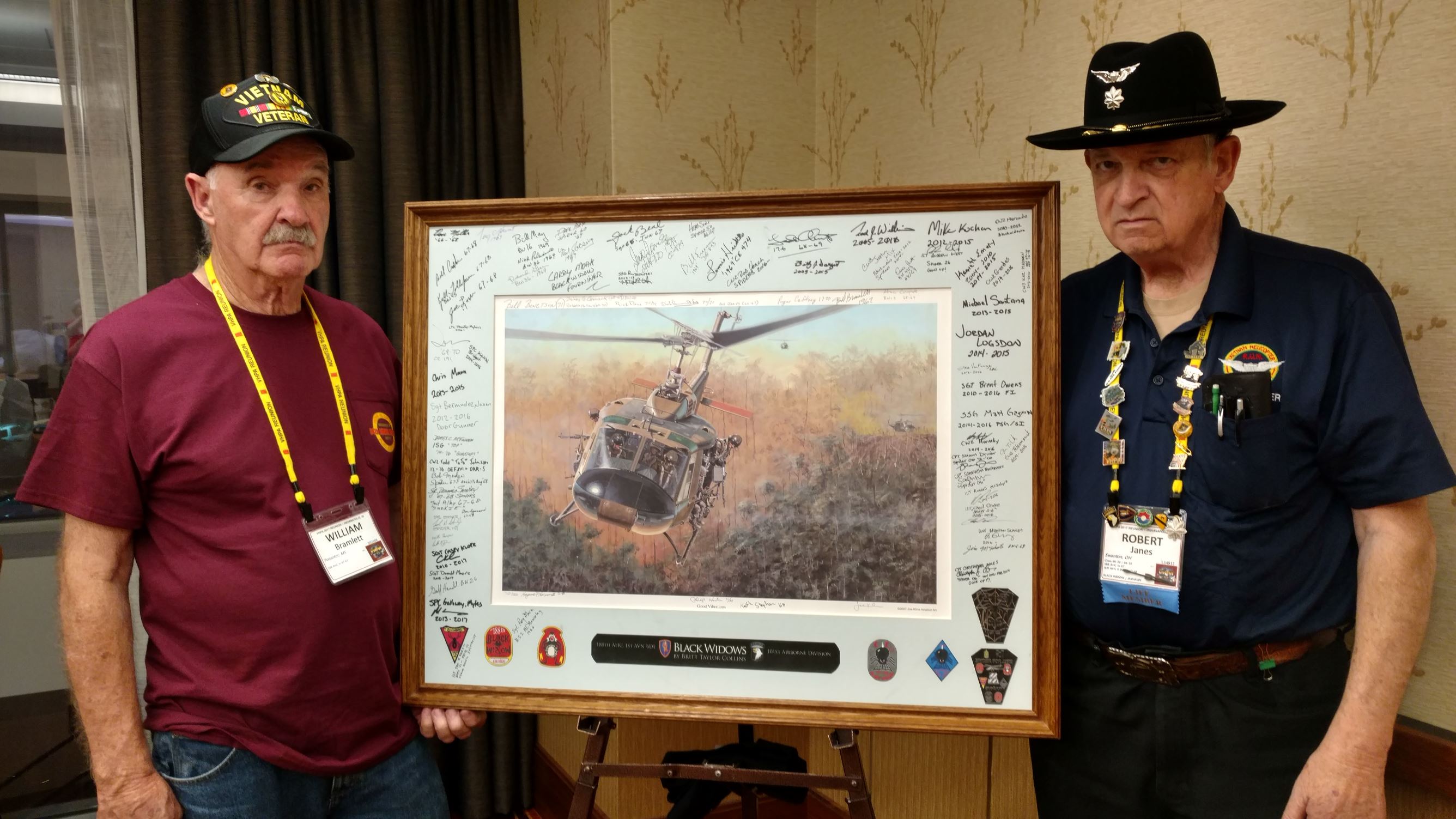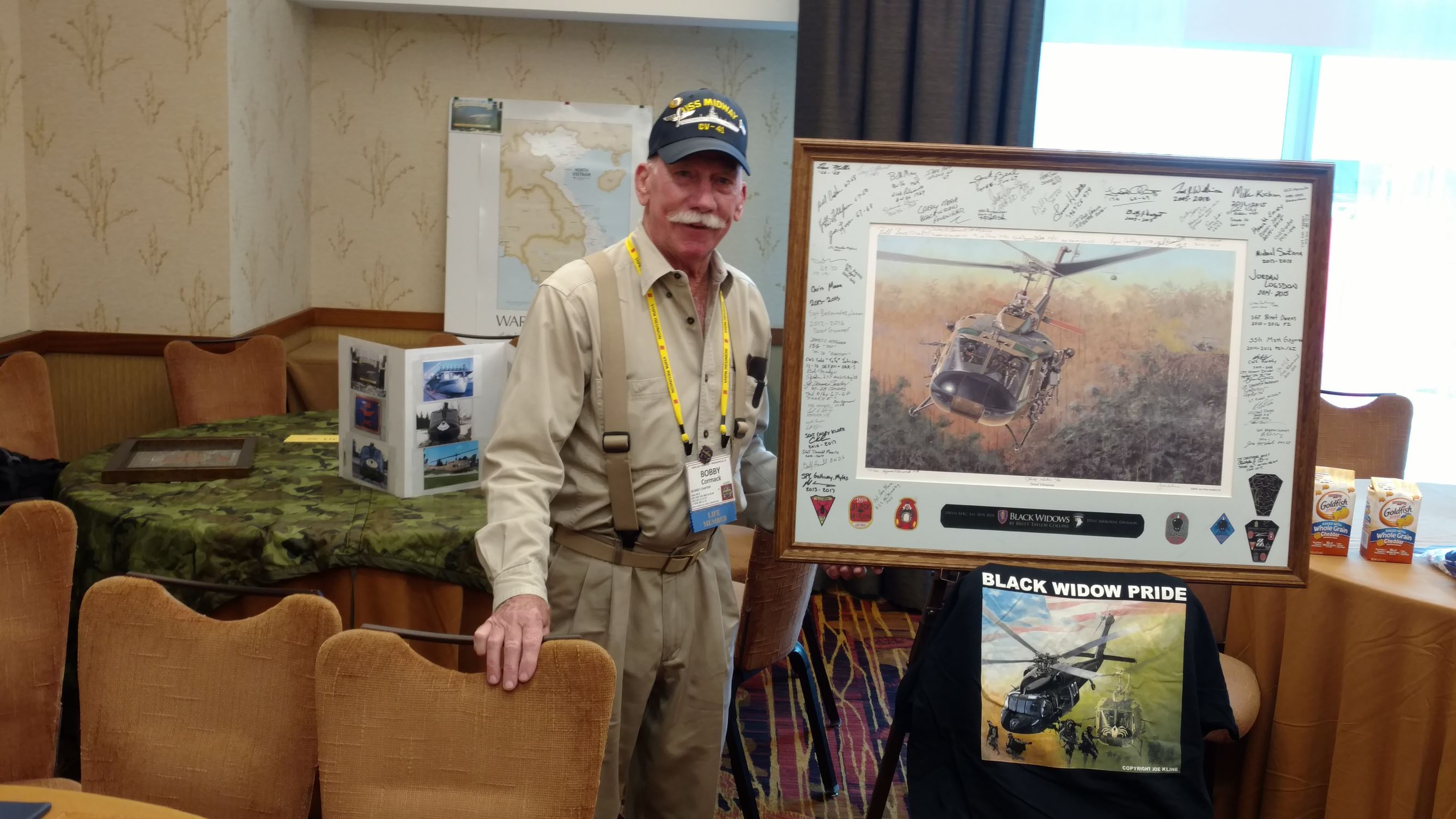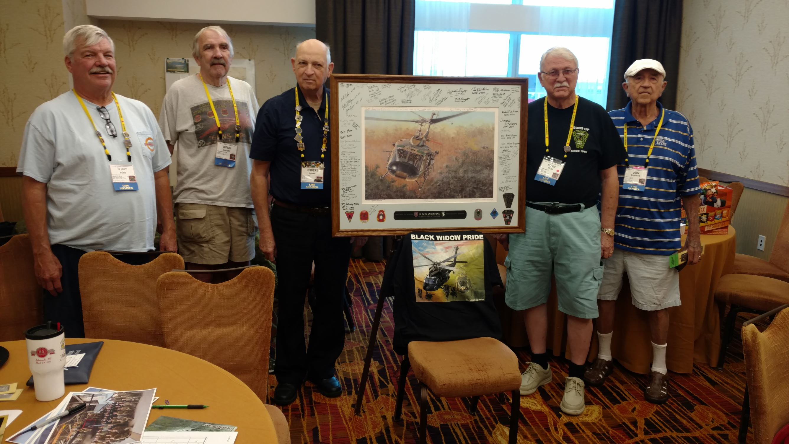 We took a group picture and some single pictures of those who were on trips and got in later.  I am sending pictures to those who requested them.  We had people who remembered us from other units who stopped by to share their stories and memories.  We had a great time telling stories and enjoying the many displays.  We saw some new faces and they signed the Helicopter picture we have been carrying to the reunions, which will be donated to the Museum at Ft. Campbell when completed.