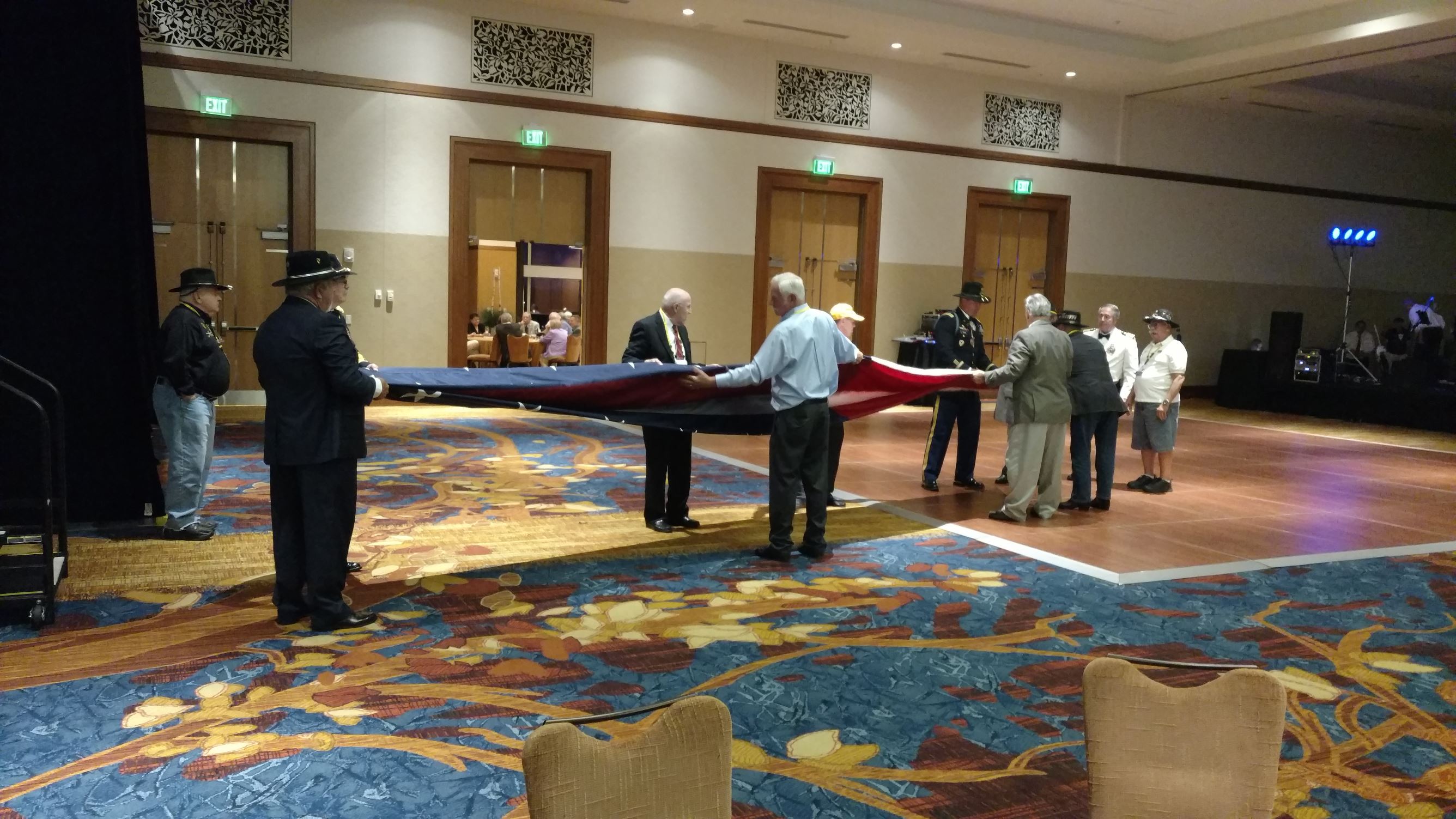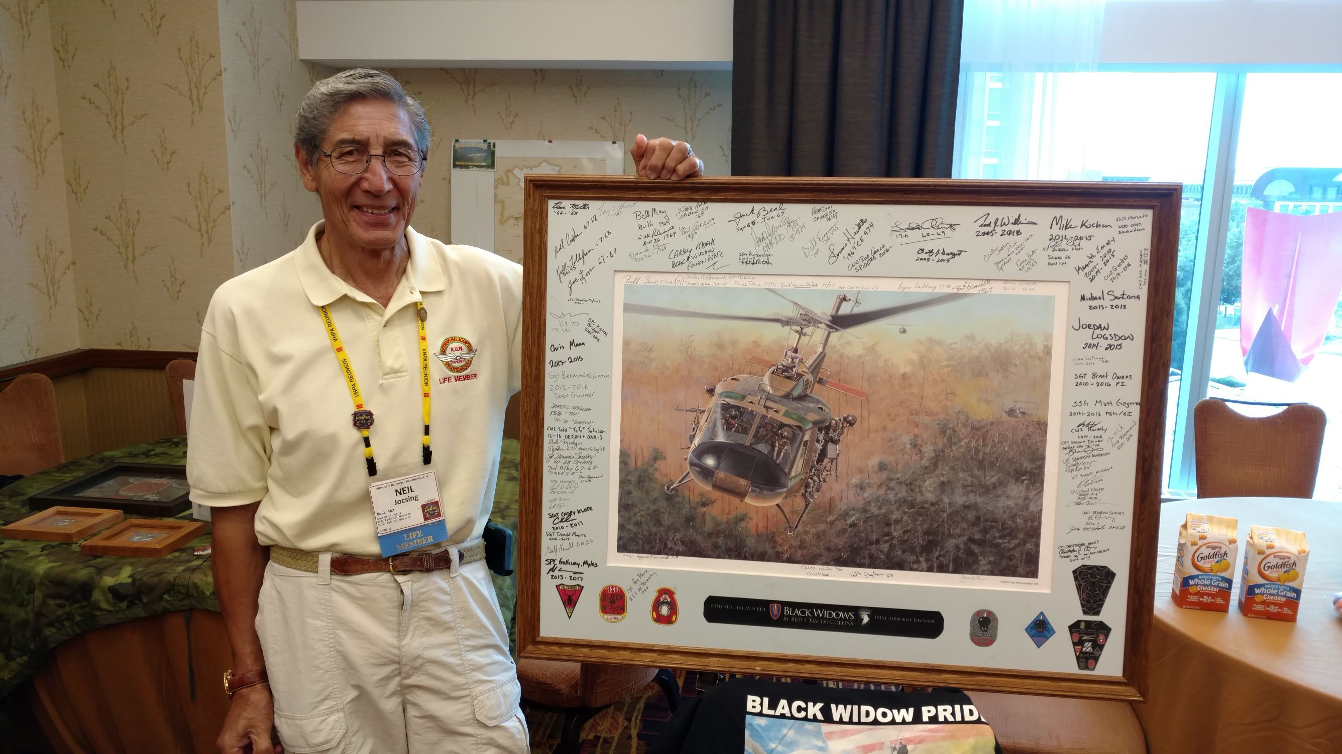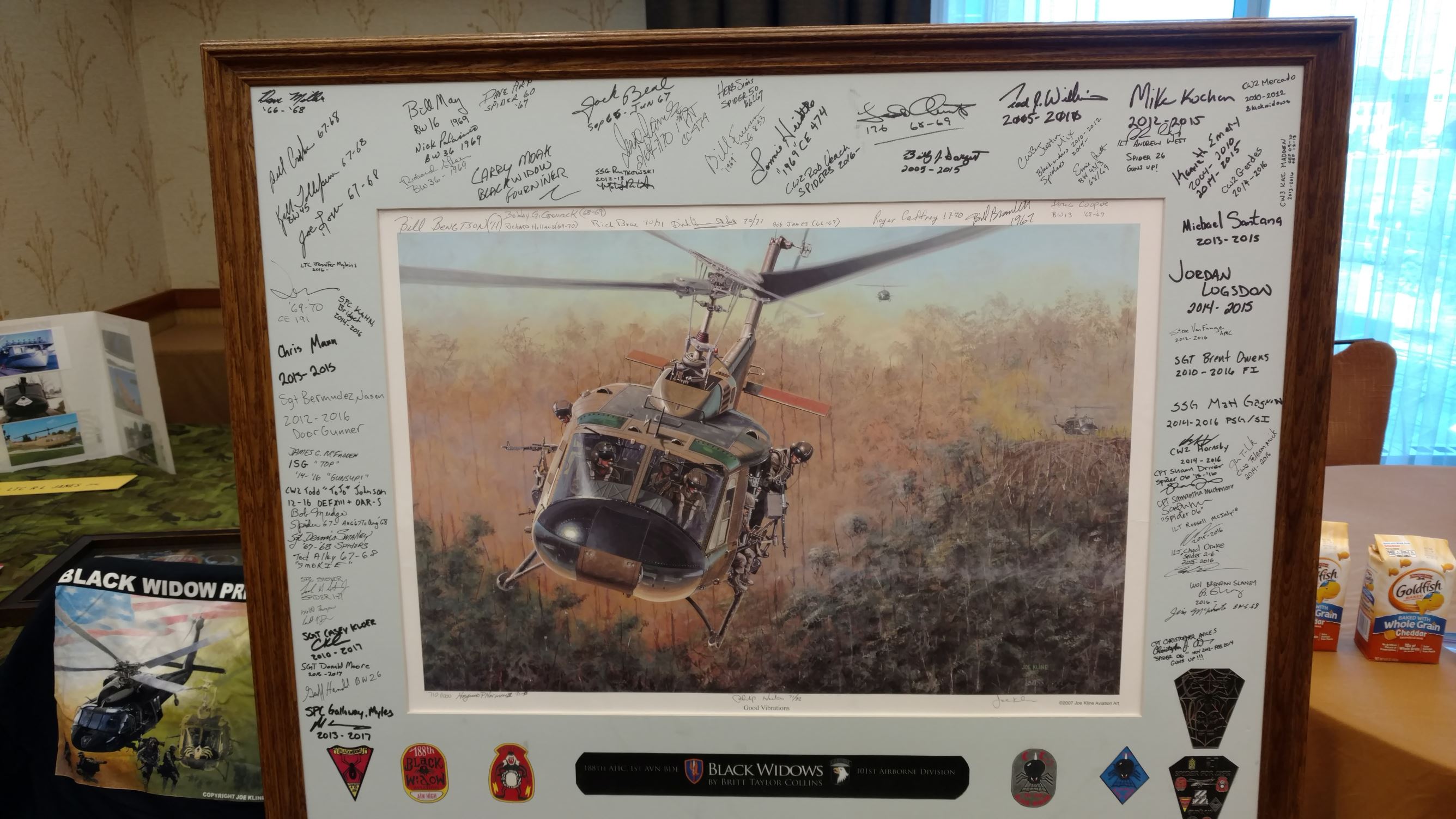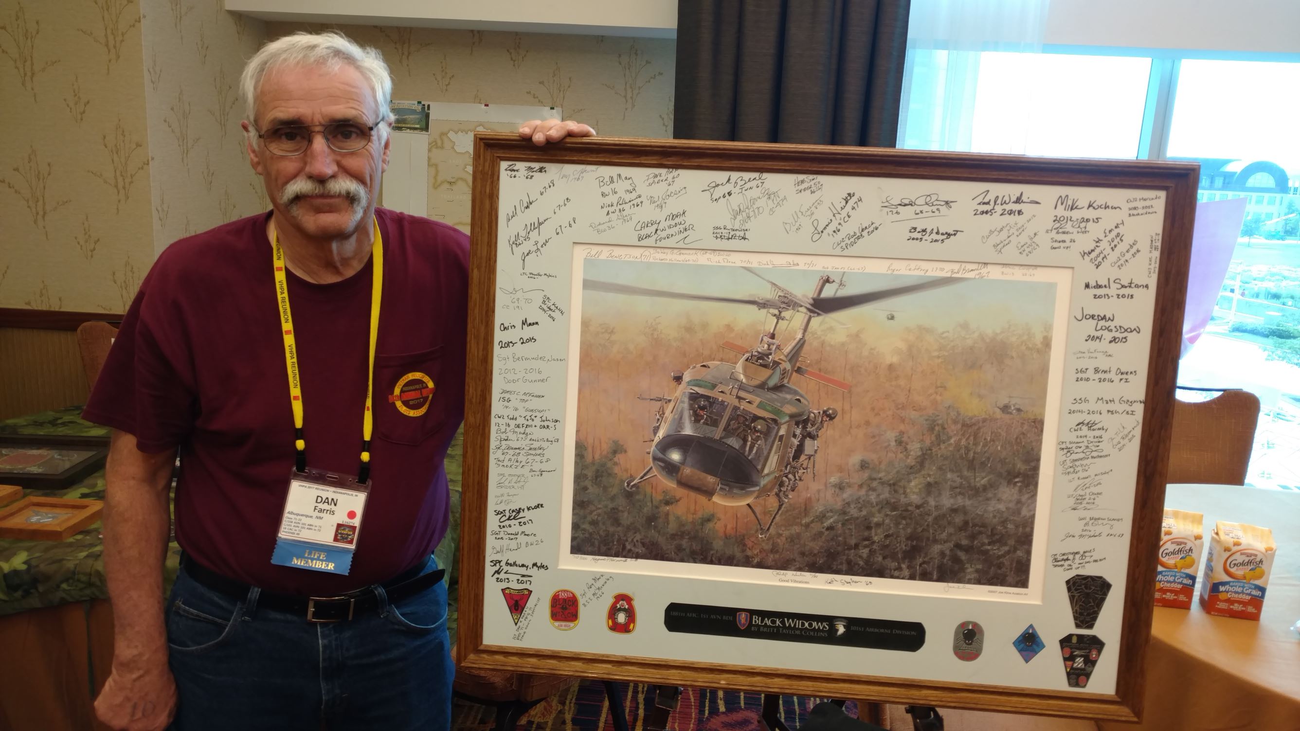 We took a group picture and some single pictures of those who were on trips and got in later.  I am sending pictures to those who requested them.  We had people who remembered us from other units who stopped by to share their stories and memories.  We had a great time telling stories and enjoying the many displays.  We saw some new faces and they signed the Helicopter picture we have been carrying to the reunions, which will be donated to the Museum at Ft. Campbell when completed.